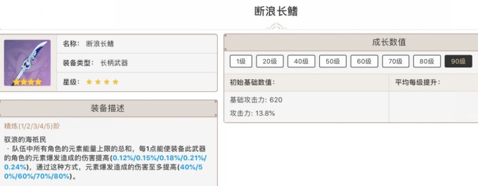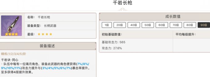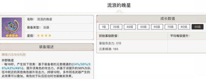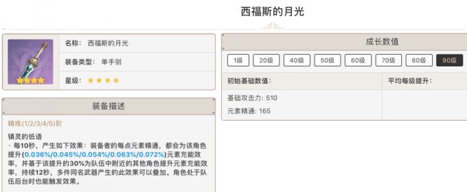 攻击力的提升中规中矩,但是元素精通高达165。但是武器特效却是根据装备者的精通提升全队的攻击力(装备者有百分之百,队友是装备者的30%。)正好适合缺精通和缺攻击的角色,特别适合纳西妲和砂糖。