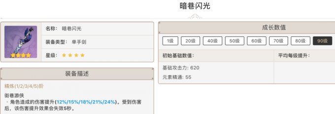 把武器的闪光点主要是白值特别高,620的数值甚至可以比肩五星了,但是副词条精通仅仅只有55点,可以说把副词条砍了,全给主词条了,武器特效是提升角色伤害。作为辅助武器这把单手剑不适合阿忍,万叶等人,但是却很是个依赖基础攻击力的班尼特!但是要注意1点,班尼特使用这把武器必须配置充能沙。