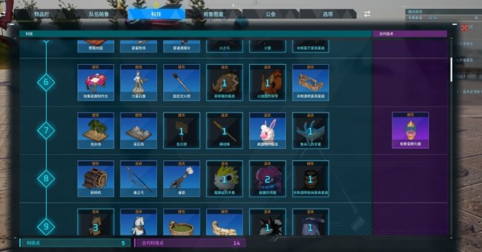 科技树划分:武器+防具+帕鲁技能+装饰物品+家园功能+古代科技