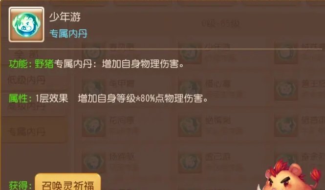 野猪的专属内丹是直接提升物理伤害的面板属性的,在1层的时候可以增加自身等级*80%的物理伤害,5层可以增加到自身等级*160%的物理伤害,这个减幅非常高,能够大大提升野猪的物理伤害。