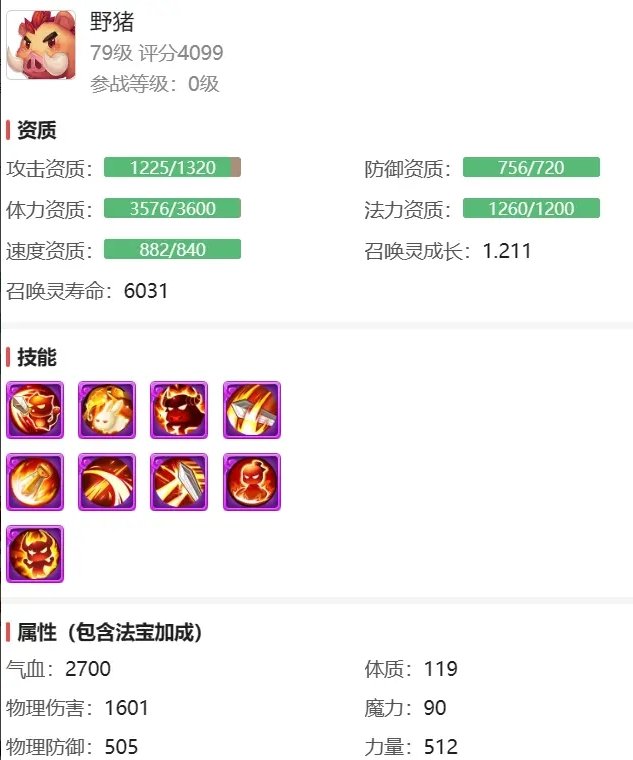简单举个例子,一直79技的野猪,在专属内丹满的情况下,天生就比同等级的召唤灵要多出79*1.6=126.4的物理伤害面板,光是这一点就是绝大多数物理召唤灵无法企及的了。