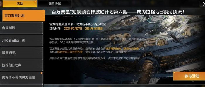 《无尽的拉格朗日》手游会定期更新内容和举办活动。零氪玩家需要关注游戏的更新公告和活动信息,及时参与并获取奖励。同时,也可以通过关注游戏官方社交媒体或论坛等途径获取更多游戏资讯和攻略。