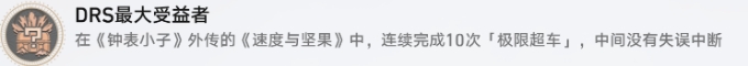 DRS最大受益者是《钟表小子》外传的解密相关成就,需要在《钟表小子》外传《速度与坚果》中连续完成十次极限超车,中间没有失误中断,成就位于【众秘探奇】。