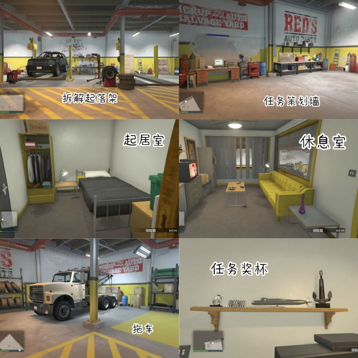 回收站可以开启枯燥乏味的夺车大战和拖车任务,地图上一共有5处回收站对玩家售出,回收站内部共有以下活动区域以及一个保险箱