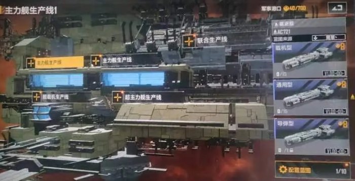 (全队共用五条生产线,分为三条主力舰生产线,一条舰载机生产线,一条超主力舰生产线,主力舰生产线位置富裕,舰载机全队只能传12个,超主力只能传8个)