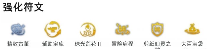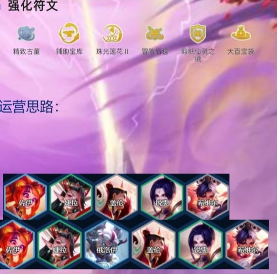 必备精致古董,可以将备战席中的成装转化为辅助装,为天使提供各种属性加成。剪纸仙灵之徽、剪纸仙灵之冕,更早开出7剪纸,提升阵容上限。冒险启程,参与击杀后不断提升天使的法强和生命值加成。珠光莲花,让技能可以暴击,增强天使的技能爆发。升级咯、耐心学习、清晰头脑、纷乱头脑,快速上人口,加速阵容成型。激昂墓志铭,弈子阵亡为友军提供护盾和攻速。药剂师、治疗法球,增强阵容的续航回复能力。大百宝袋、珍藏财宝,获得更多装备。联合抵抗,提升前排坦度。其他可选择:假人辅助、辅助宝库等。