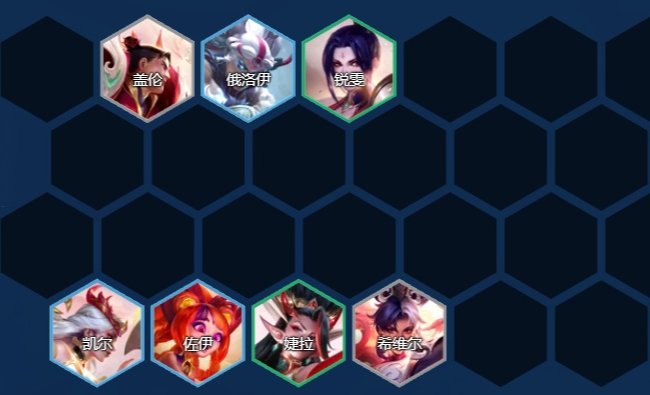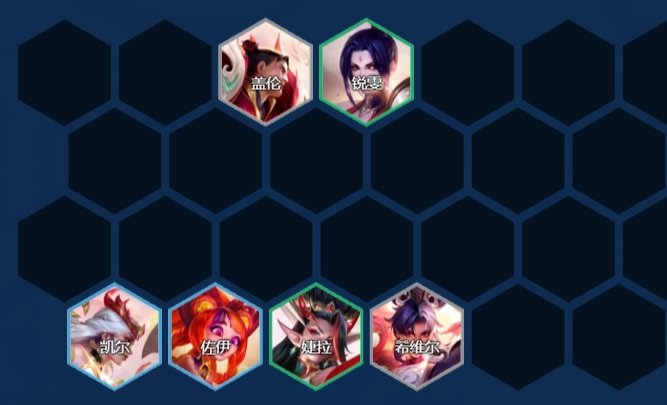 盖伦、希维尔、锐雯、婕拉、佐伊、索拉卡、妮蔻、加里奥、艾瑞莉娅。