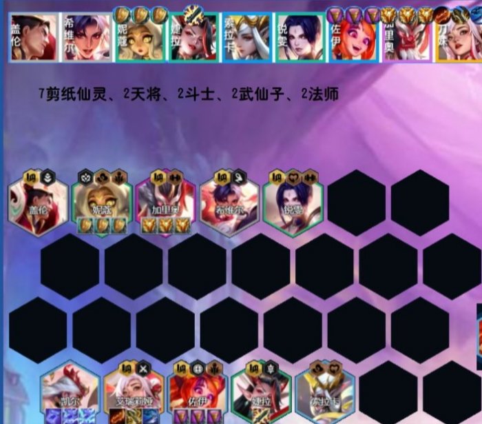 7剪纸仙灵、2天将、2斗士、2武仙子、2法师。