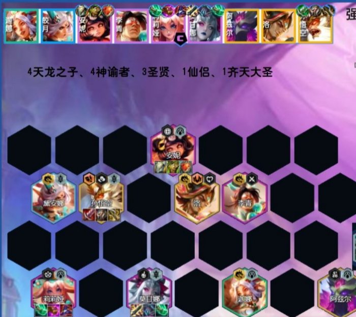 4-2拉8人口,然后大刷一波,找出阵容体系英雄,下3山海绘卷,找出安妮、李青、拉露恩、婕拉,开出4神谕者3天龙3圣贤,有阿兹尔后替换拉露恩,有孙悟空后替换婕拉,有洛后可以暂时替换李青。8人口将莉莉娅和安妮搜出两星后再上9人口。