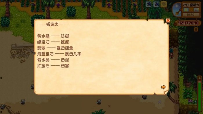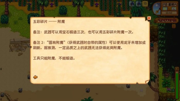 这里就是纯干货了,这张日记残页告诉了我们锻造台的锻造规则,我们每次锻造武器都需要消耗对应的宝石以及10个火山晶石,附魔则需要消耗一块五彩碎片和20个火山晶石,武器一共可以用宝石锻造三次+五彩碎片附魔一次,下面是每种宝石对应增加的属性
