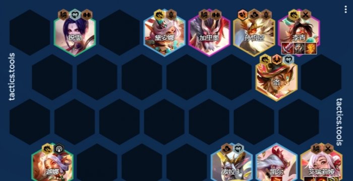 阵容组成:锐雯、黛安娜、迦娜、索拉卡、李青、加里奥、孙悟空、洛、艾瑞莉娅