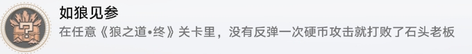 在任意狼之道终关卡里,没有反弹一次硬币攻击就打败了石头老板,通过拾取子弹进入强化模式,发射子弹击败石头老板即可解锁成就。
