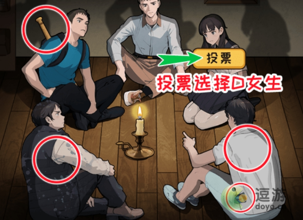 5、点击受伤的腿、脸上打斗淤青、腰间的绳子、手指红色,投票给D女生