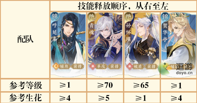 2、参考练度:4花贺华亭1级+1花孙怀瑾65级+5花青魂70级+4花呼延泰1级