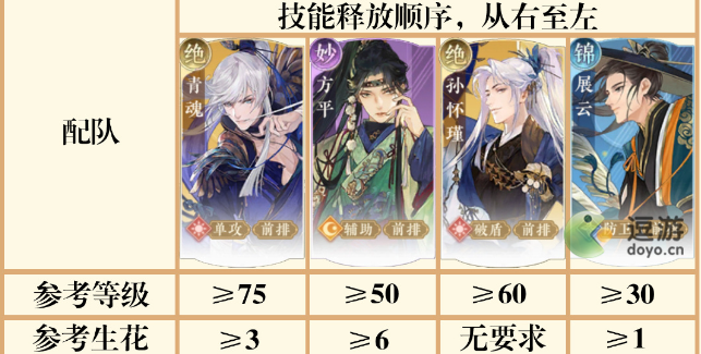 2、参考练度:1花展云30级+0花孙怀瑾60级+6花方平50级+3花青魂75级