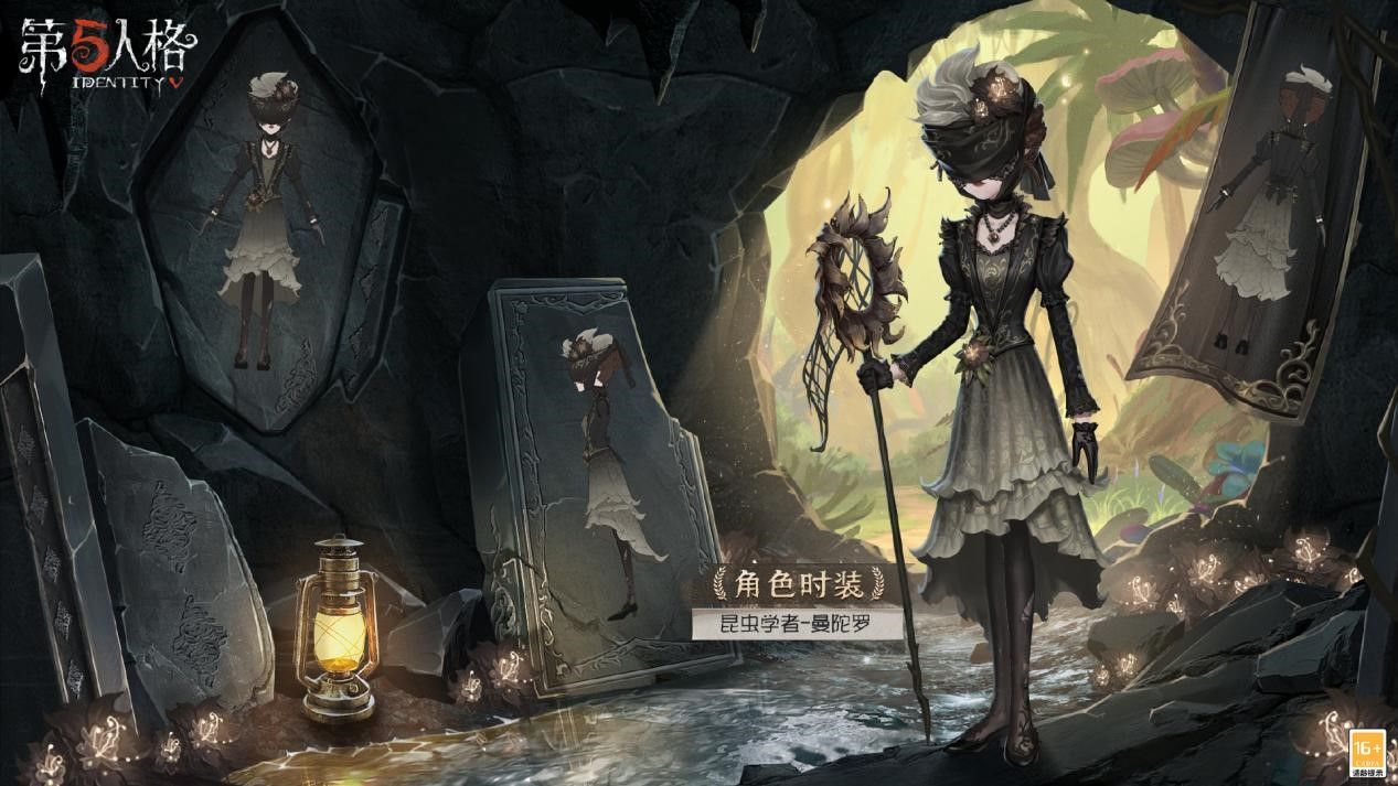 昆虫学者-曼陀罗的渐变色长裙如同一朵迷人的曼陀罗,黑色纱巾遮住上半张脸,使她更显神秘;曼陀罗花在发梢和腰间盛放,但捕虫网上的花瓣已经枯败,只有获得所需的滋养,花中精灵才能醒来,重焕光彩。