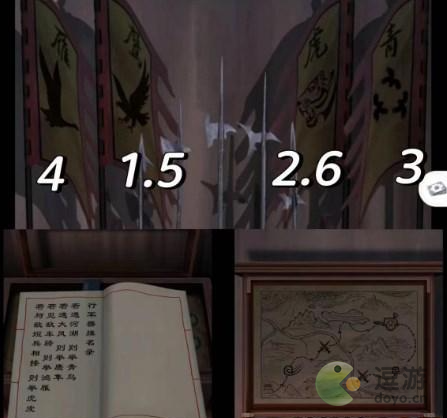 6、〖切换左边场景(军营)〗沙盘上【军札记第二页】结合沙盘得到旁边箱子密码【7259】,得到【一面军旗】插入右边放旗子的地方