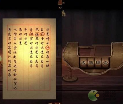 4、〖切换左下场景(卧房)〗左下角桌上得到【火折子】点燃灯,桌上得到【巡夜告示】,在灯旁边展开得到信息,打开密码盒子【2541】