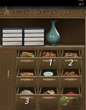 1、书桌上得到【百草录】,打开得到信息【牛黄&柴胡&茯苓】,九宫格柜子打开,在中间柜子得到【火折子&空碗】药材位置