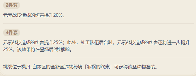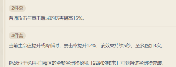 获得地点:挑战位于枫丹-白露区的全新圣遗物秘境[罪祸的终末]可获得该圣遗物套装
