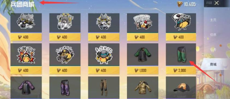2、进入到兵团后点击右侧第四个选项“商城”,然后在商城页面向下滑,只需要兵团币就可以购买身法裤子了。