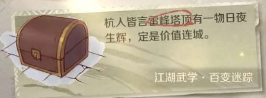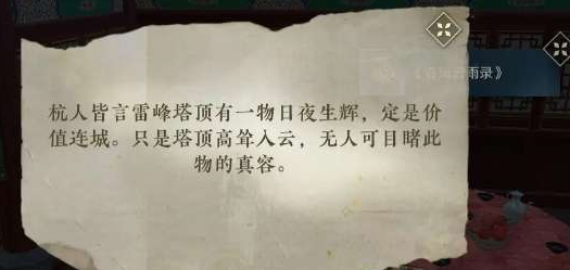 2、解锁宝箱之后就可以看到相关的线索,【杭人皆言雷峰塔顶有一物日夜生辉,定是价值连城。只是塔顶高耸入云,无人可目睹此物的真容】;