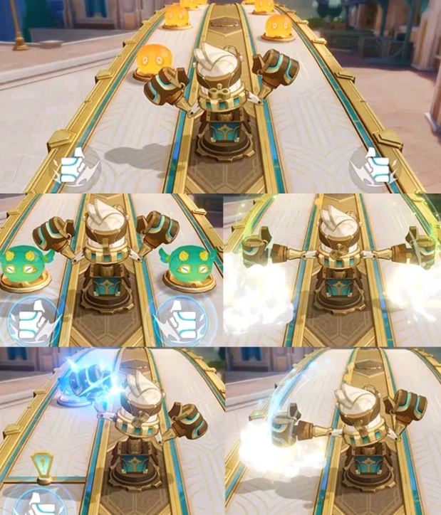 挑战中,需要操纵冒险家玩具,跟随音乐的节拍,在恰当的时机进行攻击,打击轨道两侧的玩偶。