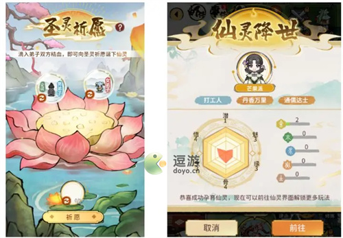 3.两名弟子前往祈愿池共同祈愿可诞生下一代。仙灵从诞生开始逐渐成长,经历拜师、修炼、奇遇等,一步步提升境界和属性,获取仙灵心法、法宝和仙灵伙伴,从而开启一段全新的文字游历体验。