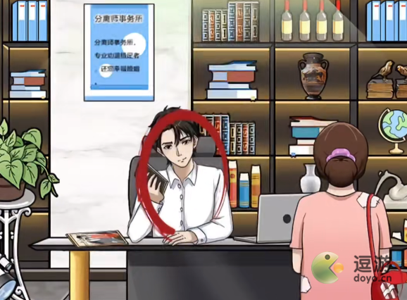 4、点击妻子手上的手机,点击照片,点击返回按钮回到主页,点击聊天软件图标,点击聊天记录;长按1s有裂缝的砖,点击遗嘱;点击秘书的表情、男人的表情