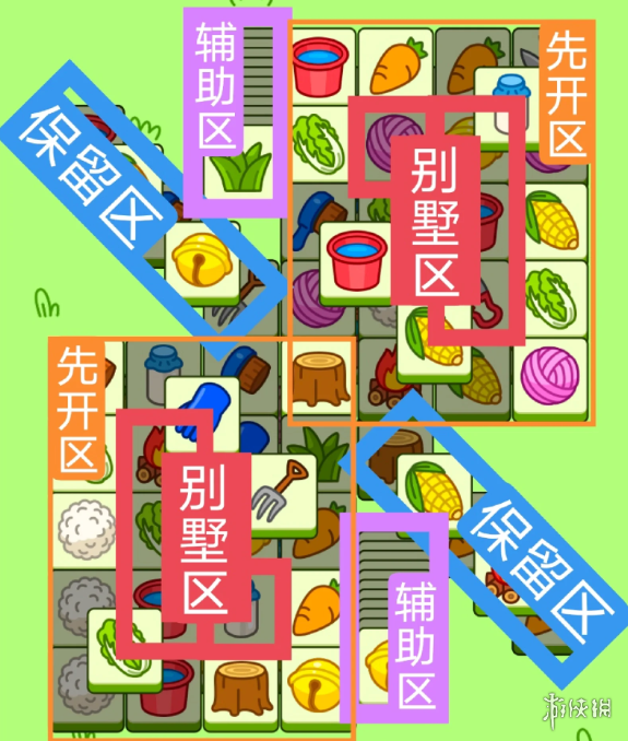 四个L字型大别墅组成,开局先消除橙色区,然后按照一层层均匀消除表面牌, 哪里压牌比较多就先消除哪里,必要时可以用盲盒区辅助消除表面牌。尽量还是以别墅区内互相消除为主。蓝色区有叠牌,但是不多,全部保留到后期使用。