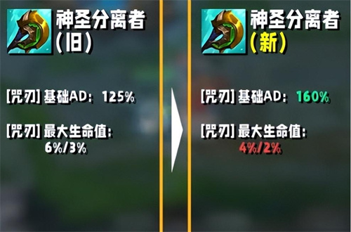 它提供了攻击力、生命值和技能急速属性,同时拥有独特的被动效果:在使用技能后,下一次普攻会造成额外的物理伤害,与之不同的是这次对方将使它造成额外的百分比伤害。这使得神圣分离者成为了一件适合单挑和适合团战的装备。