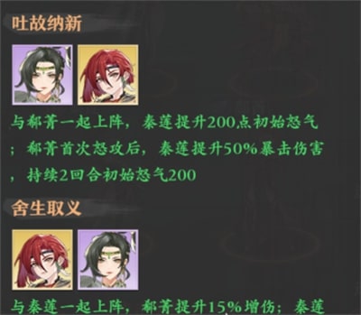 可以被分为九宫和宁战。他们分别拥有减少敌人伤害和怒气的能力,而且还能够提供一定程度的范围伤害效果。这种双重作用既在抵御伤害方面,又在输出方面为队伍提供了一定的支援。此外,郗菁和秦莲的配合更是可以施展出大量的暴击输出能力,以更高的效益为队伍作出贡献。