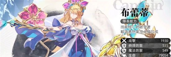 可以给范围内血量最低的单位附加一个能够抵挡1次伤害的特殊护盾。当解语者等级达到4阶时,特殊护盾的期间内目标攻击力还会提高10%。布蕾蒂的普攻还能够回复范围内血量最低的单位的怒气。而如果该单位是队长,则回怒效果将会有一定程度的降低。