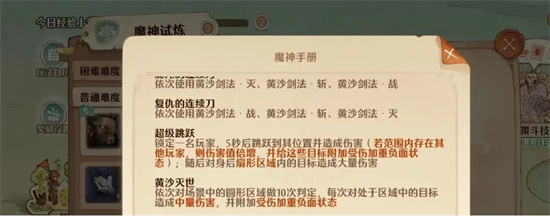 第四个技能是沙尘暴,可以在屏幕上形成十个圆形,任何进入这个圆形的玩家都会受到伤害,并且会受到负面状态。技能五:风沙:只有在风沙叠加的空隙里才能起到闪避的效果,有时候靠着墙壁还能起到一定的效果。6.大沙尘暴:这是莫格拉斯的绝招,范围攻击,让人避无可避,只能在五秒内被打断,而且一旦发动,就是全军覆没的结局。
