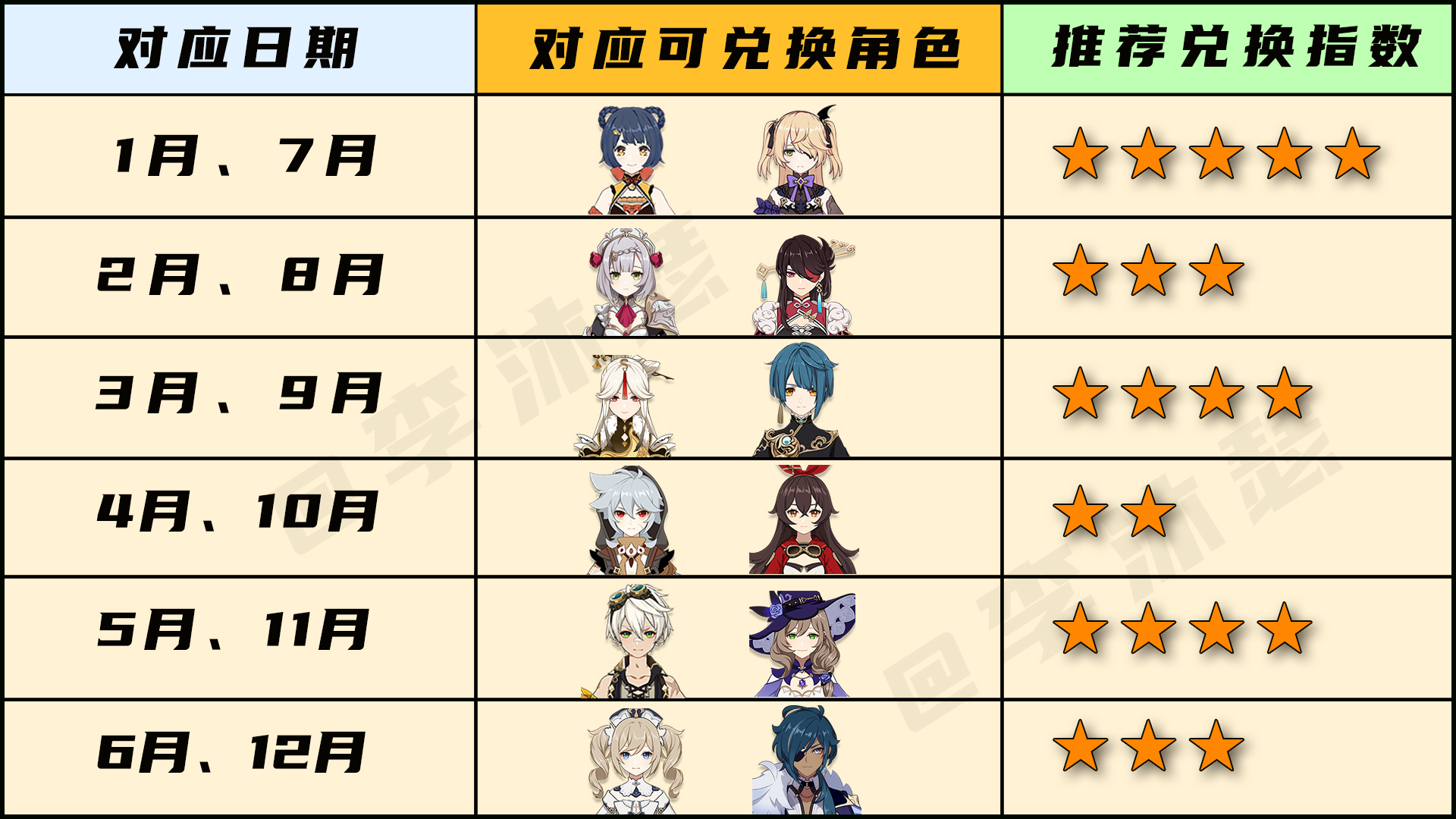 1月:菲谢尔、香菱2月:北斗、诺艾尔