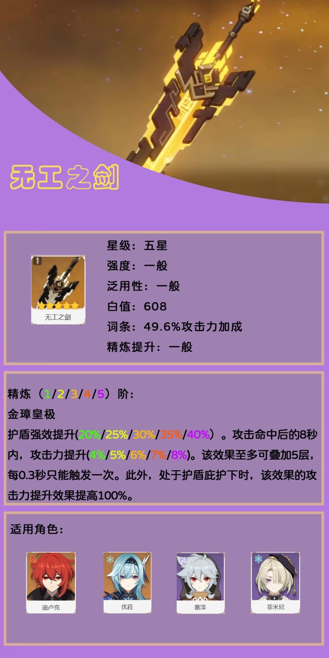 这把武器外观设计不错,不知道为什么感觉有点丑。且由于大剑角色普遍不带盾,因此这把武器带来的提升就不如狼末了。况且狼末还不是限定武器,且有一定的辅助队友的能力。无工之剑的拉胯让很多人戏称其为蜈蚣大剑。