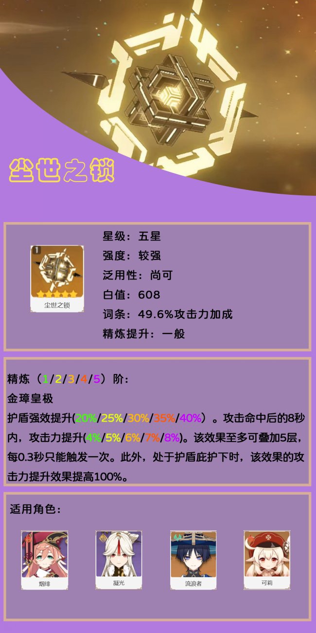 凝光:尘世之锁的外观与凝光还是挺配的,而且凝光一般情况下会带钟离,凑双岩的同时安逸输出。就算不带钟离,凝光所有的攻击手段全是岩伤,很容易出结晶,也就比较容易吃满尘世之锁的特效。