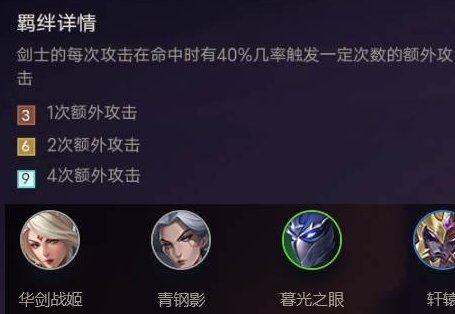 2.增加普攻攻击效率的羁绊,在触发剑士羁绊后,剑士棋子每次攻击都有40%概率额外攻击1/2/4次,额外攻击带来的不仅是伤害上的提升,还能带来法力值的收益,能快速回蓝,增加技能释放效率,增强战斗力。