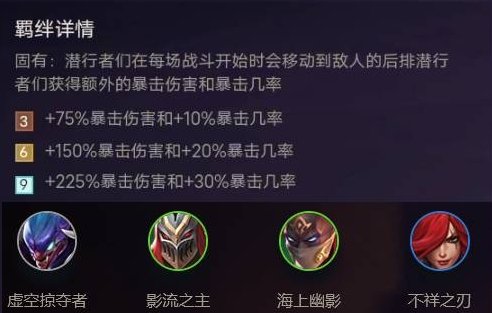 3.纯输出羁绊,增加暴击几率与极大增加暴击伤害,让刺客棋子们输出能力极高。