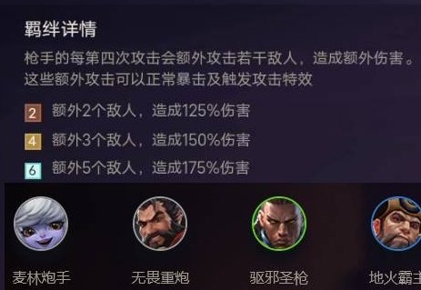2.纯输出羁绊,①枪手们每第4次普攻就能额外攻击2/3/5名敌方棋子,群伤能力特别强。②枪手的额外攻击也可以暴击和触发攻击特效,枪手可触发攻击特效装备:斯塔缇克电刃、卢安娜的飓风、巨人杀手、朔极之矛、汲取剑、羊刀、泰坦的坚决、最后的轻语、正义之手、红霸符、肃静、巨型九头蛇、诅咒之刃。