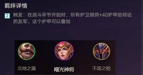 2.羁绊效果在开局增加护卫附近棋子40护甲,这个效果可以叠加,如下图北地之盾与曙光神将组成2护卫羁绊,场次6枚护卫棋子均能给天罚弩神增加40护甲,总共给天罚弩神增加40*6=240护甲。