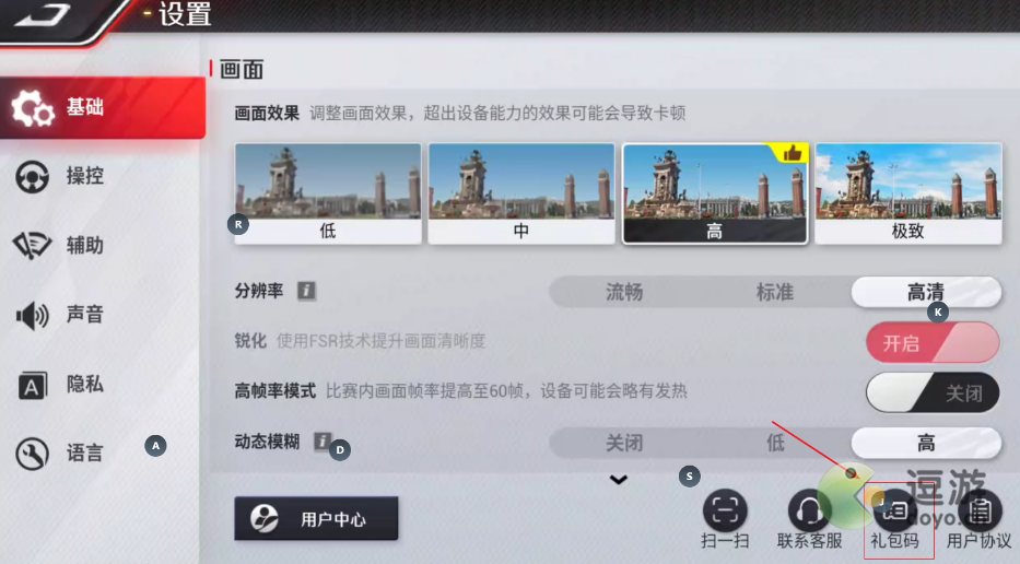 2、然后在“设置”-“基础”界面,找到右下角的“礼包码”并点击,弹出“兑换码”输入窗口。