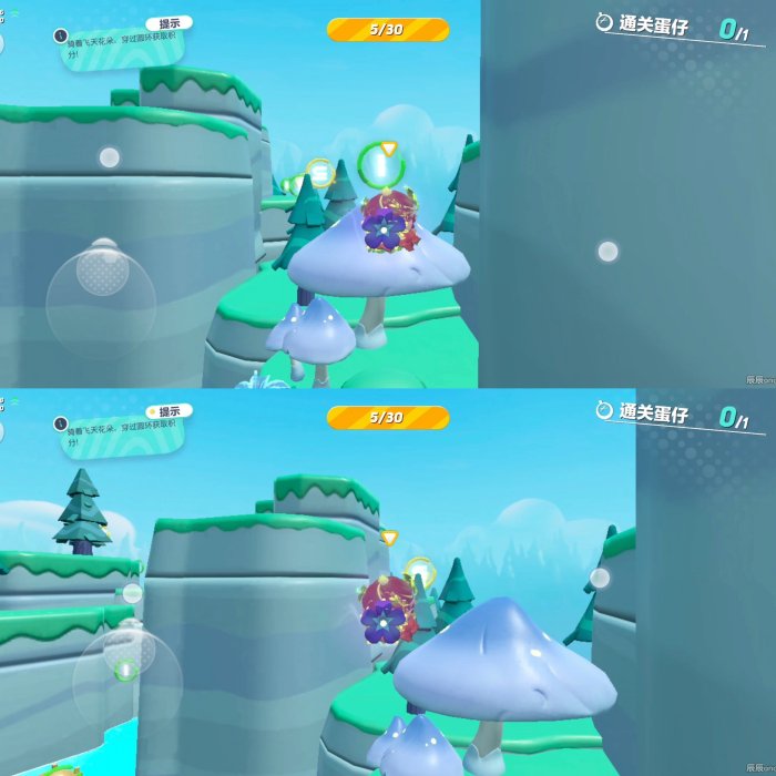 我们的积分需要通过穿过对应数字的圆环来获取,目前只看见一分和两分,没见到五分。一分环是绿色,都是固定不动的,两分环是黄色,会左右移动稍微有一点点困难。穿过圆环即可获得对应积分,而在我们的视角中,这个圆环的积分就会消失,要过一段时间才会恢复,所以不能通过一个环反复刷。积累到30分,即可通关。