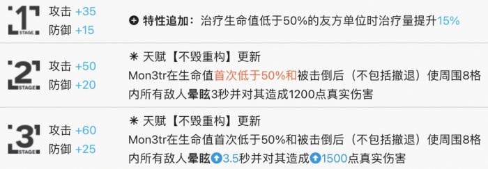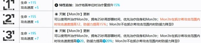 此后我们可以看出,x模主要的特效在于对于M3自爆属性的提升,二级以后可以在血量低于50%时触发一次【不毁重构】,y模主要的提升在于对M3提供了20%防御加成以及20点的攻速提升(注意基础攻速+7不能作用于M3而是作用在凯尔希本体上)对于20点的攻速提升可以让使用三技能M3可以多啃两下,并且会提前整体攻击节奏,使三技能总伤提升5000+,二技能方面也可以提升约20%的效果(也就是又多砍两下),属于比较纯粹的增伤。