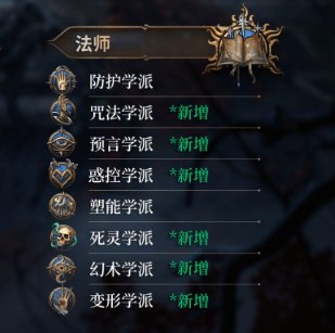 子职业:防护学派、咒法学派、预言学派、塑能学派、死灵学派、幻术学派、惑控学派、变形学派
