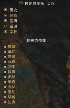 游戏中一共有这17种技能,黄色的勾选熟练项是你在出身中选择的背景决定的,例如侍僧出身会给予洞悉和宗教两项技能熟练项。而白色的技能熟练项是由你自己自由选择的,且可选的技能熟练项和非熟练技能是由你的职业决定的。例如牧师职业可以在历史、医药和游说中选择两项。