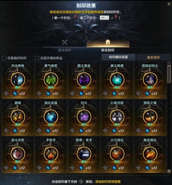 增益刻印分为战斗刻印和职业刻印两大类,战斗刻印所有职业都可以装备,而职业刻印则只能装备与玩家所选择职业相符的。