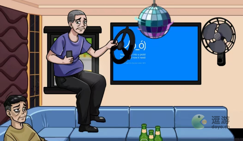 3、接着左滑收起窗帘,把紫衣服的男人拖到窗边,拖动起子拆掉风扇扇面,再拖动卸下来的方向盘给男人,装作在开车,即可过关