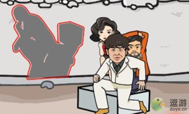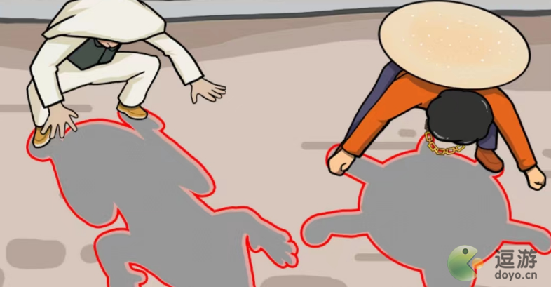 1、疯狂梗传影子变变变,需要进行影子躲猫猫,第一关点击人物改变姿势如图所示,将大饼拖给趴着的阿江