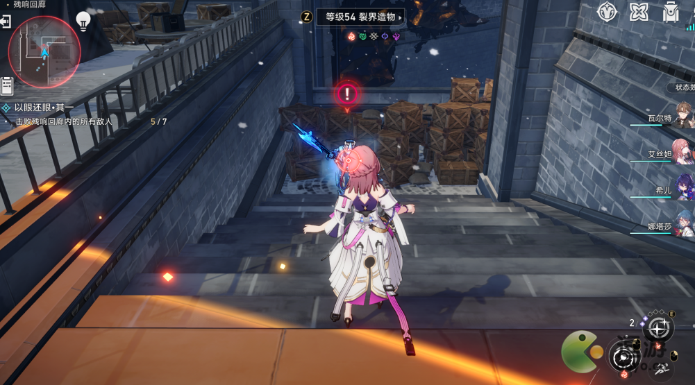 6、从右侧的楼梯往下能够看到一个怪物,让他进入警觉状态,然后将他拉入到红圈内触发火弱点再攻击进入战斗